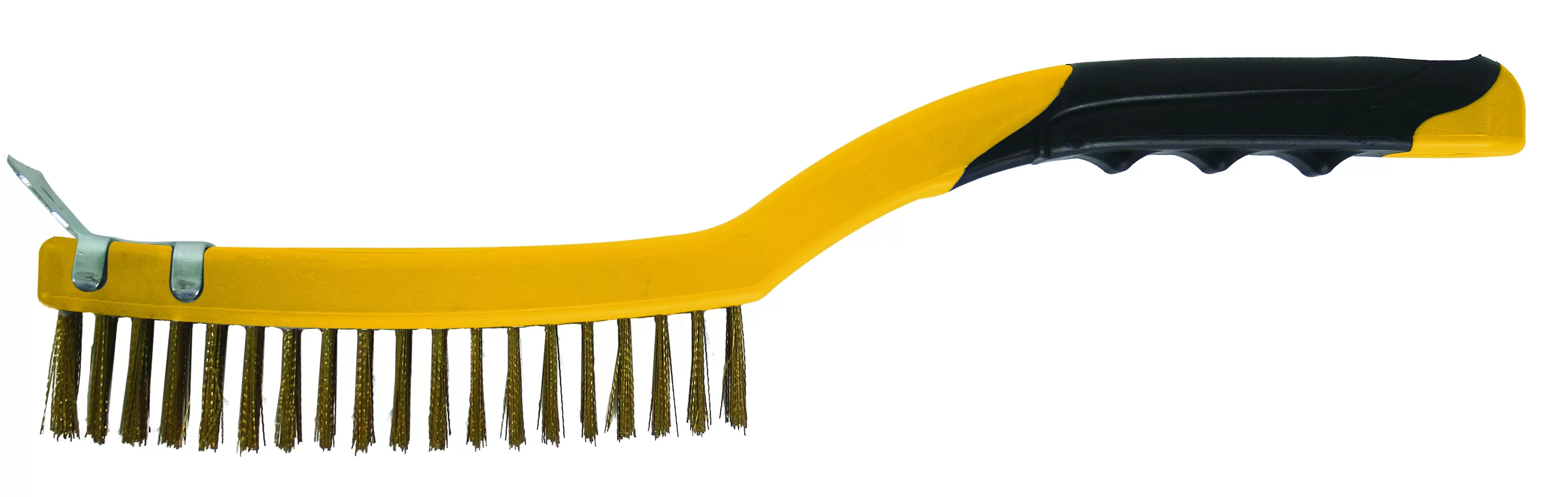 Professional 3-row brass wire brush with integrated scraper for enhanced cleaning performance. The radial bundle arrangement allows for efficient removal of rust, paint, and grime. The ergonomic dual-layer handle ensures a secure and comfortable grip. Brass wire makes this brush suitable for cleaning delicate metal surfaces without causing damage.