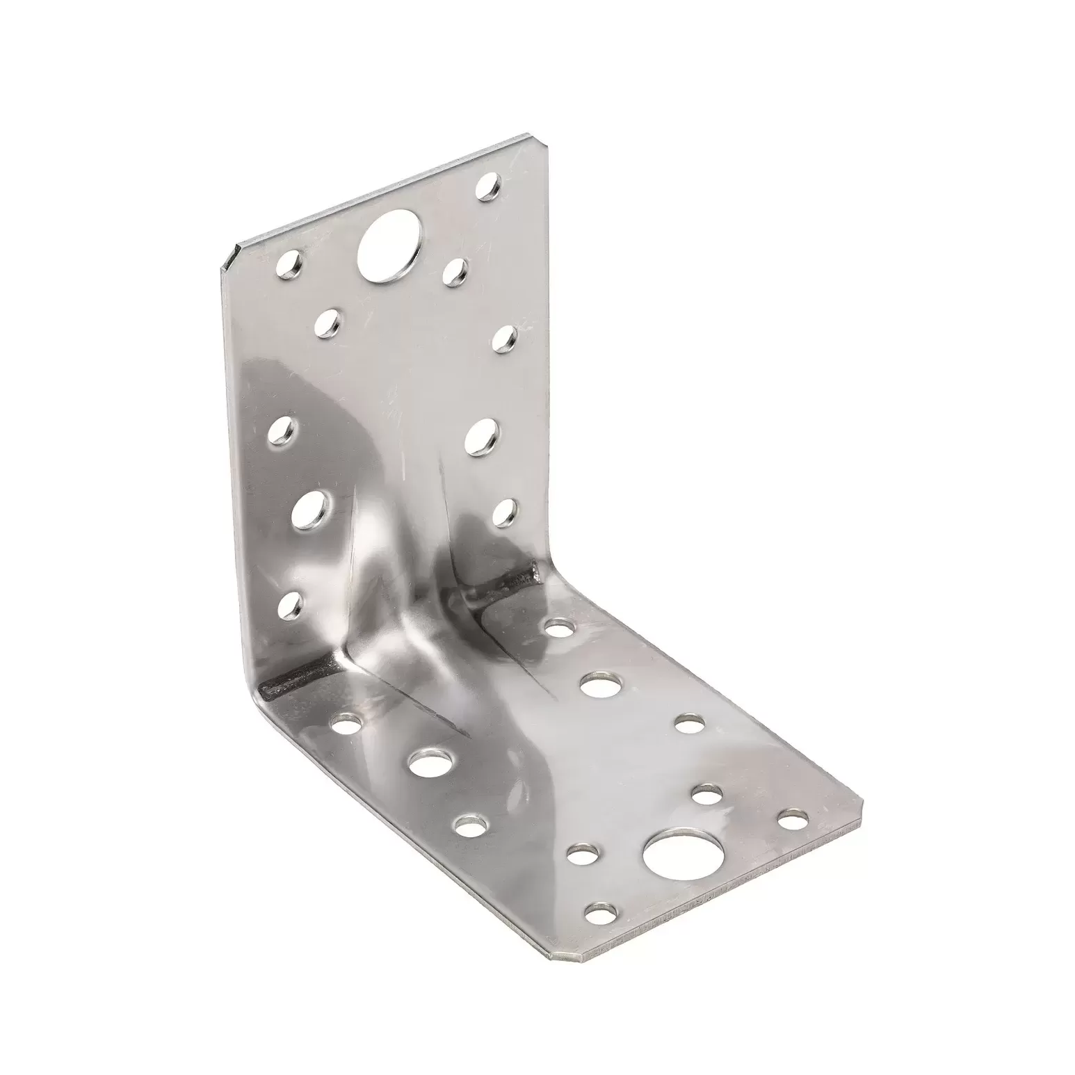 Universal corner bracket with stiffening rib, made of 2 mm thick steel. Designed for creating strong and stable joints. Ideal for wooden structures and furniture assembly.