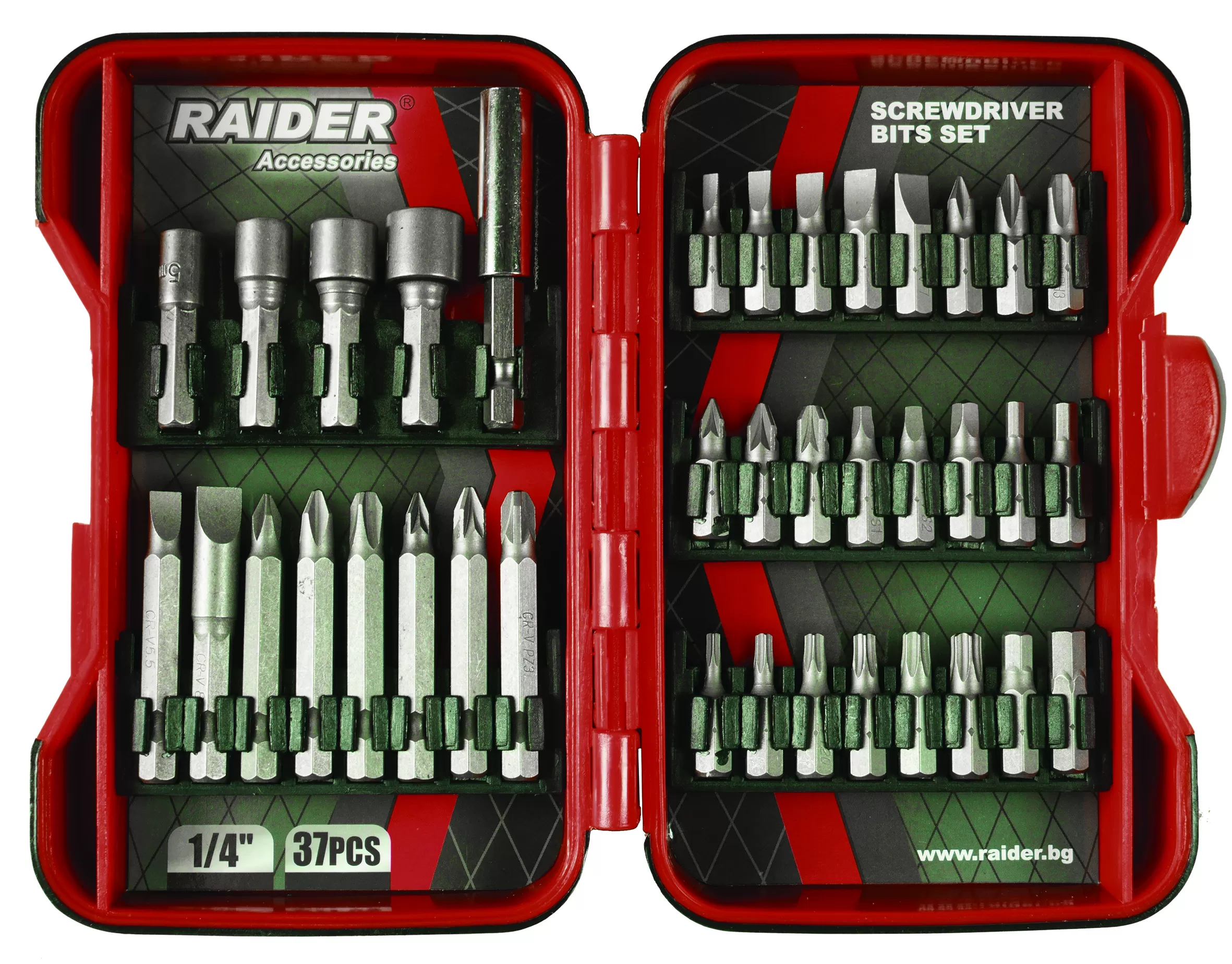 The RAIDER Power Tools 37-piece bit set is designed for a wide variety of fastening applications. Crafted from high-quality chrome vanadium steel (Cr-V), all bits are stored in a compact and durable storage box for easy access and portability.