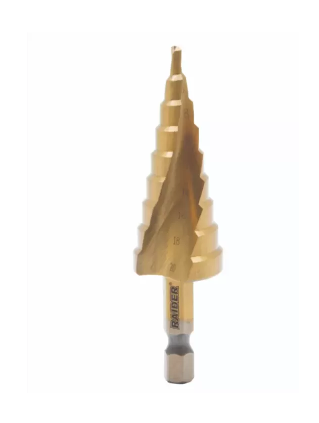 This drill bit for sheet metal is manufactured by Raider Pro from high-quality HSS+TiN steel with a self-centering tip for precise drilling. It is suitable for sheet metals such as non-ferrous metals, steel sheets, plastic, and stainless steel. The spiral flute reduces vibrations and provides up to 40% faster penetration with low friction and minimal wear. The shank is hex 1/4" for stable and convenient operation.