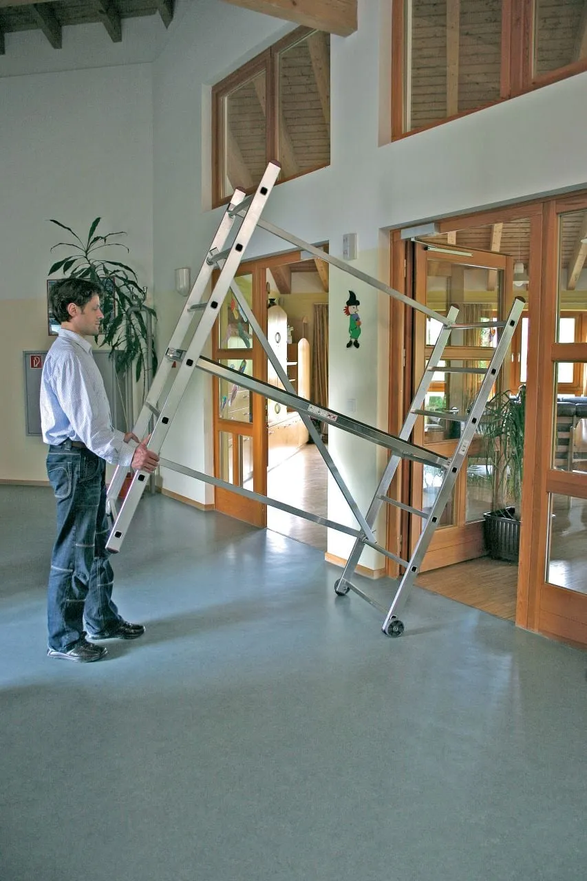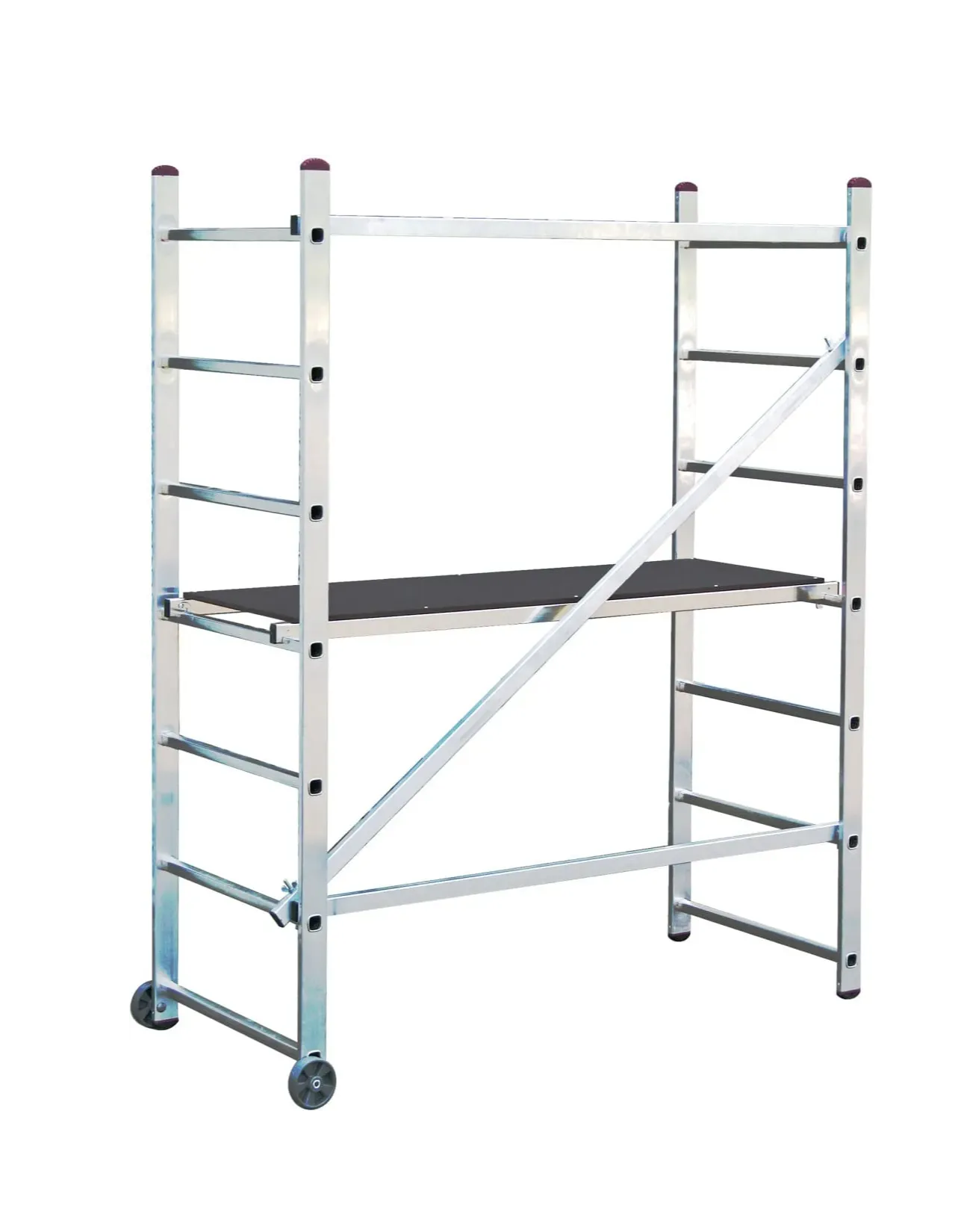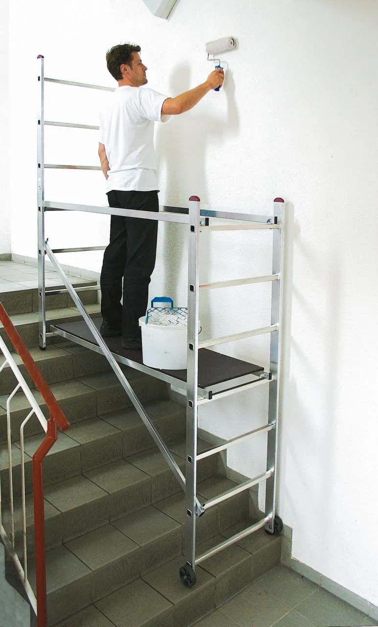 Моделът разполага с широка и сигурна работна платформа, алуминиеви профилни рамки и диагонали за допълнителна стабилност. Интегрираните колела със спирачка осигуряват лесно преместване и безопасност по време на работа. Скелето е подходящо за използване на стълбища и площадки и покрива почти всички области на приложение при вътрешни и външни дейности.