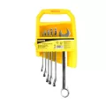 Професионален комплект от 6 звездогаечни ключа с размери 8 мм, 10 мм, 12 мм, 13 мм, 14 мм и 17 мм, изработени от висококачествена хром-ванадиева стомана (Cr-V) за максимална здравина и издръжливост. Всеки ключ разполага с глава, наклонена на 15°, което улеснява работата на труднодостъпни места. Комплектът е с хром-никелово антикорозионно покритие и изцяло полиран с огледален завършек. Включва удобна стойка за лесно съхранение и преносимост. Отговаря на стандарта DIN 3113.