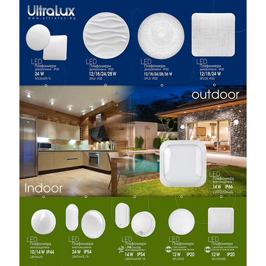 LED плафониерите Ultralux са енергоспестяваща алтернатива за основно осветление в жилища, хотели и търговски помещения. Те създават приятна атмосфера при ниска консумация на енергия, около 80% по-ефективни от конвенционалните лампи и с до 50 пъти по-дълъг живот. Подходящи за хол, трапезария, детска стая, коридор или спалня.