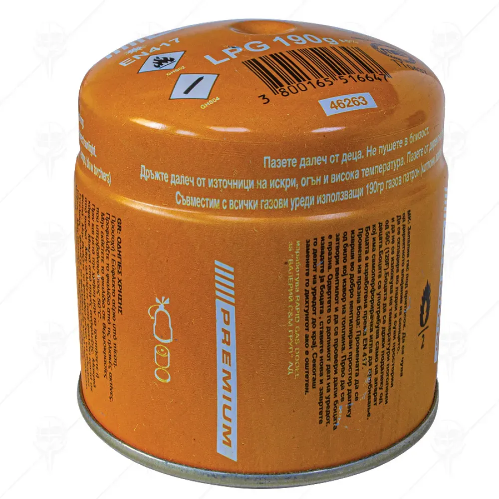 Патронът е с компактни размери и съдържа 190 г газ, което го прави удобен за транспортиране и съхранение. Подходящ е за различни газови уреди, използващи стандартни 190 г газови патрони.