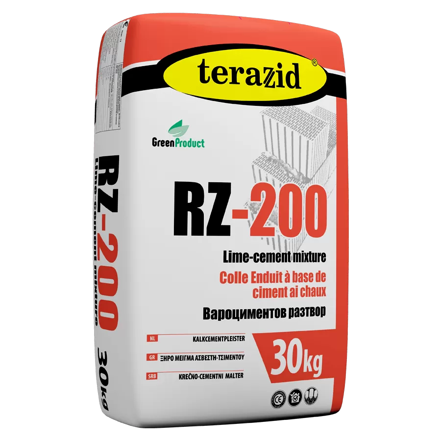 Terazid RZ-200 е сух вароциментов разтвор, произведен по изискванията на БДС EN 998-2:2010/NA:2013, предназначен за зидане на керамични тухли с вертикални кухини. Продуктът е подходящ за вътрешно и външно приложение и е съвместим със силозните системи на Terazid.