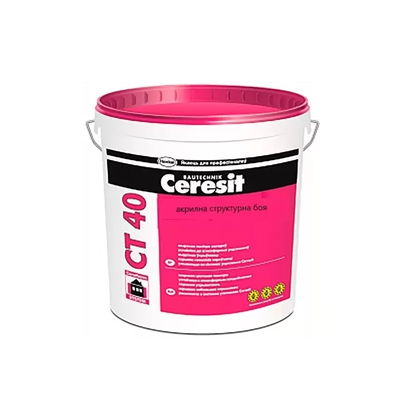 Ceresit CT 40 — водно-дисперсионная акриловая структурная краска для наружных и внутренних работ. Предназначена для окрашивания минеральных оснований: бетон, кирпич, цементно-песчаные и гипсовые штукатурки. Может использоваться как декоративно-защитный слой в системах утепления с пенополистирольными плитами. Обеспечивает матовое покрытие с выраженной структурой и хорошей укрывистостью.